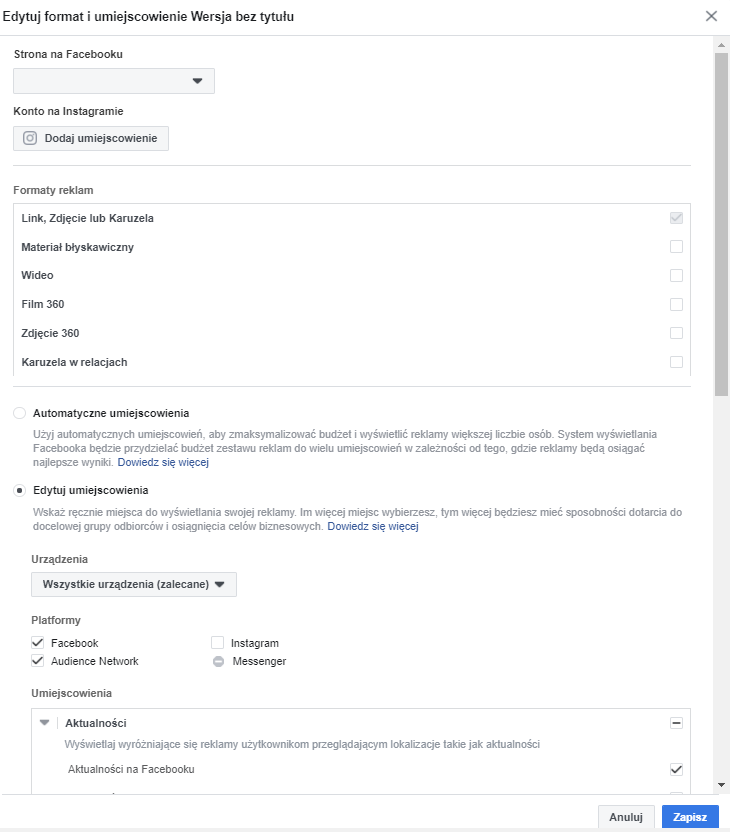 Ostatnim etapem jest wybór formatów i umiejscowienia. I tutaj też bez niespodzianek dostępne są formaty typowe dla danego celu reklamowego.