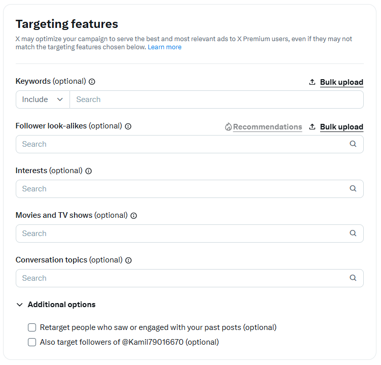 Podczas konfiguracji kampanii reklamowej X Ads dostępne są różnorodne opcje targetowania, które pozwalają precyzyjnie dopasować reklamy do określonych grup odbiorców. Wśród podstawowych kryteriów znajdują się m.in.: